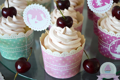 Für das Topping wird das Eiweiß mit dem Zucker über ein Wasserbad auf 80°C erhitzt. Wichtig ist hier, dass ihr die ganze Zeit rührt damit das Eiweiß nicht stockt. Danach mit einer Küchenmaschine (oder Handmixer) zu Baiser schlagen, so lange bis das Eiweiß abgekühlt ist. Dann löffelweise die Butter hinzufügen und zum Schluss langsam den Kirschsaft dazugeben. Die Creme in ein Spritzbeutel füllen und auf die Cupcakes spritzen. Und mit je einer Kirsche dekorieren.